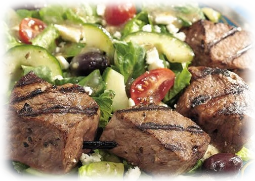 1 lb beef top round steak, cut 1-inch thick 1/3 cup each lemon juice & water2 tsp dried oregano ½ tsp salt½ tsp pepper 1/3 cup olive oil6 cups romaine lettuce, torn 1 medium cucumber, thinly sliced½ small red onion, cut into thin wedges 2 Tbsp crumbled feta cheese8 Greek or ripe olives (optional) 2 pita breads, toasted, cut into wedgesDirections:Whisk lemon juice, olive oil, oregano, salt, and pepper in a small bowl. Place beef steak and ½ of the marinade in food-safe plastic bag; turn to coat. Close bag securely and marinate in refrigerator for 6 hours or as long as overnight, turning occasionally. Reserve remaining marinade. Preheat oven broiler. Remove steak from marinade and discard this portion of the marinade. Place steak on rack in broiler pan so surface of beef is 2 to 3 inches from heat. Broil 17 to 18 minutes for medium rare doneness, turning once. Remove; let stand for 10 minutes. Carve into thin slices. Combine beef, lettuce, cucumber and onion in large bowl. Add reserved marinade; toss. Sprinkle with cheese and olives. Serve with pita wedges.
